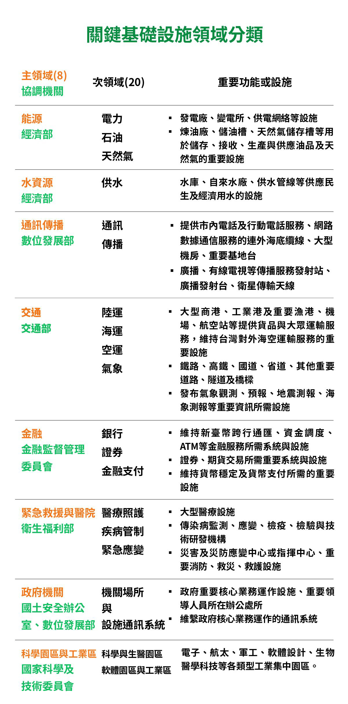 包含能源、水、通訊傳播、交通、金融、醫療與救援、政府機關、科學園區與工業園區等 8 大主領域,另外再細分為 20 個次領域,分別有各自的主管機關,協調各設施制定各自的安全防護計畫。