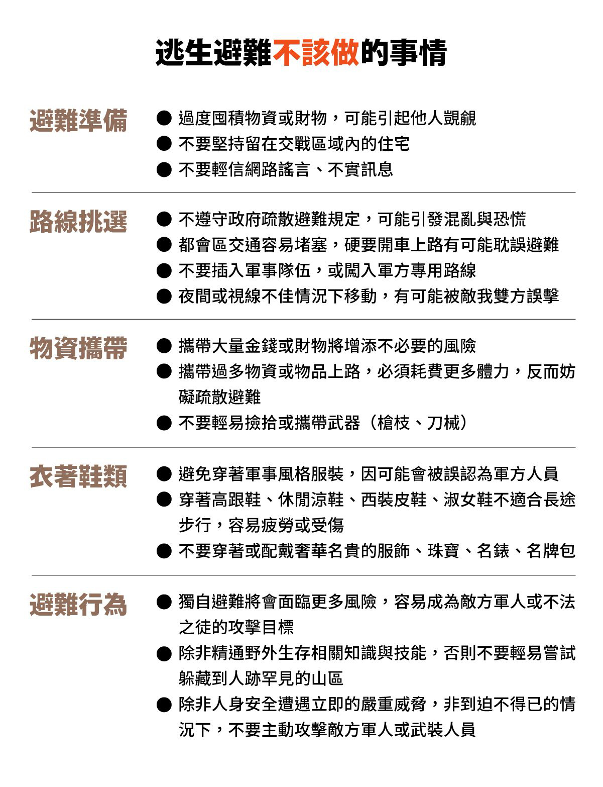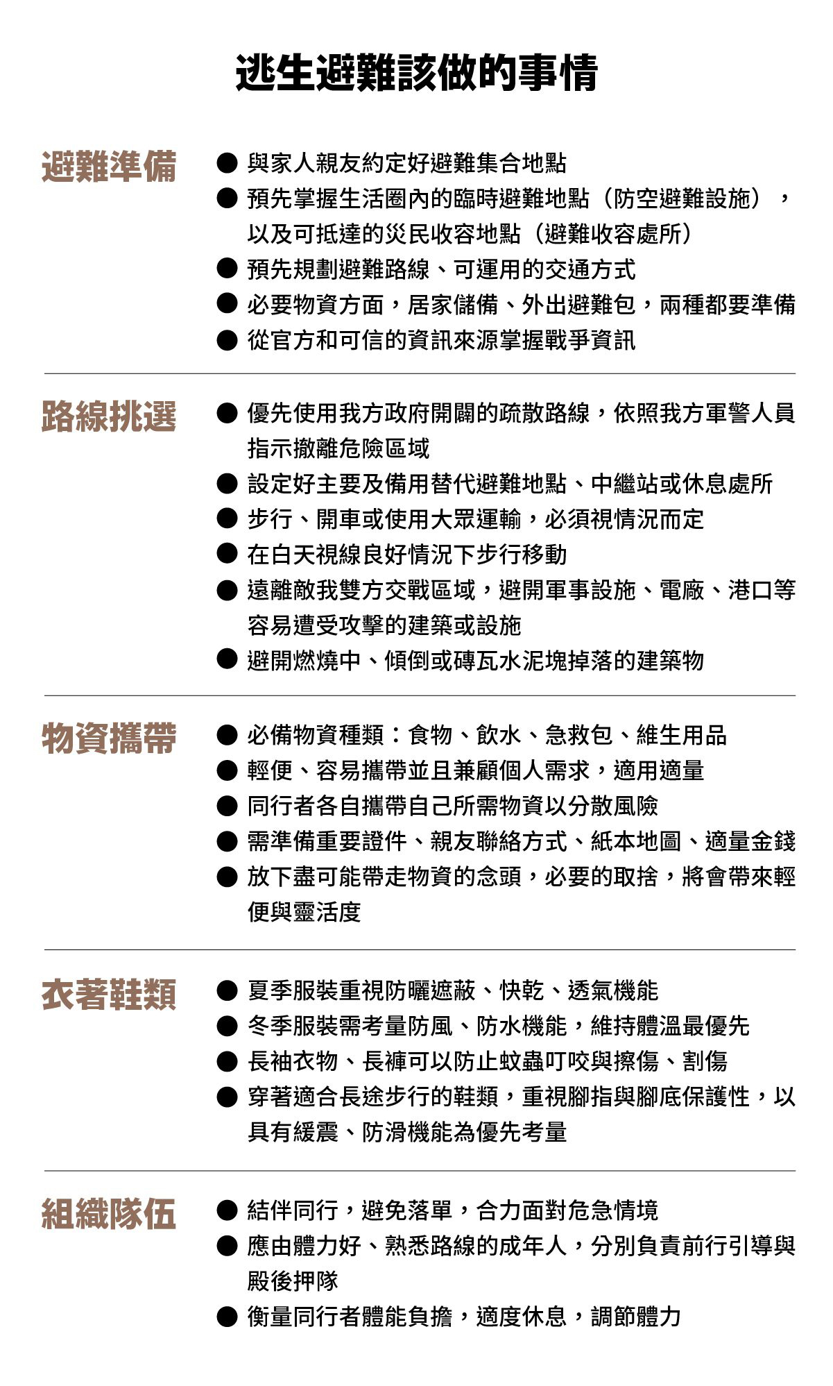 離開家園固然令人不捨,面對侵略者無情挑起的戰火,當下還是應該優先確保生命安全,依照我方政府開闢的安全路線和運輸規劃,移動到避難地點。在戰爭的情境下,疏散撤離應該注意哪些事情?哪些行為會妨礙避難?一起來看看吧!